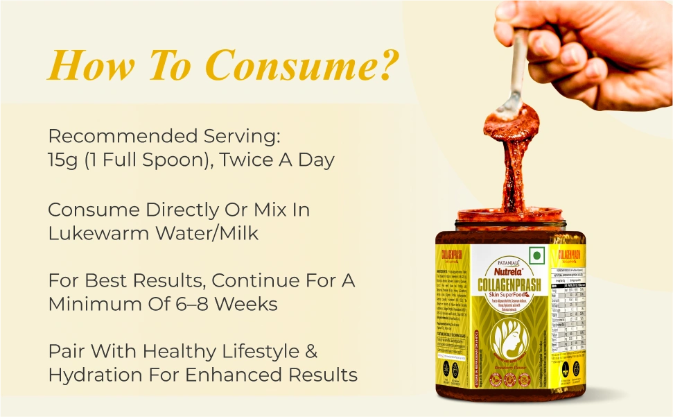 Patanjali Nutrela Collagenprash is an advanced anti aging skin superfood for men and women for maintaining healthy skin. This Vegetarian and gluten-free product contains no added sugars, making it a safe and effective choice for enhancing your skin's youthful glow.