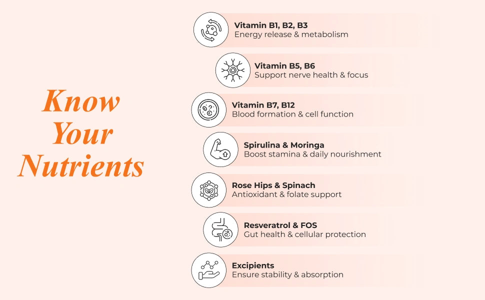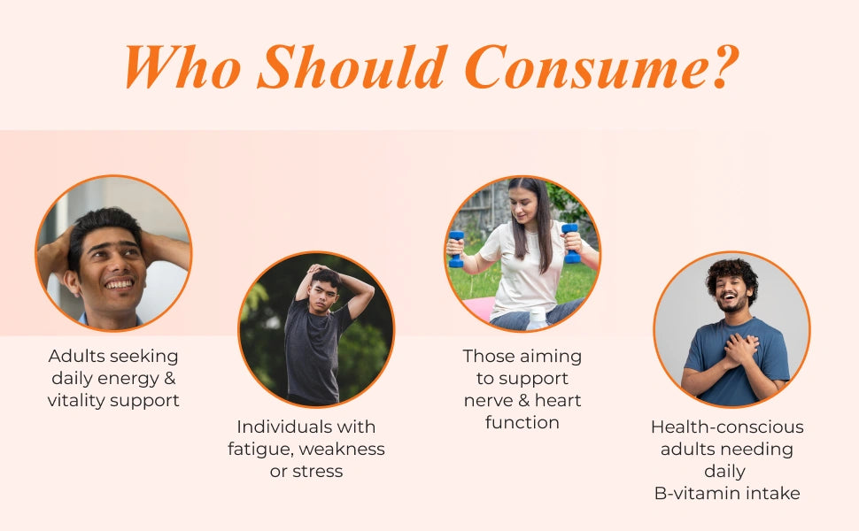 Nutrela Vitamin B-complex is a clinically tested* dietary supplement containing plant based extracts that helps in energy release, nerve function, heart function, fight fatigue and support blood formation. • B-complex vitamins are water soluble in nature, play crucial roles in maintaining overall health and well-being. They include eight different B vitamins: B1 (Thiamine), B2 (Riboflavin), B3 (Niacin), B5 (Pantothenic Acid), B6 (Pyridoxine), B7 (Biotin), B9 (Folic acid), and B12 (Cobalamin).