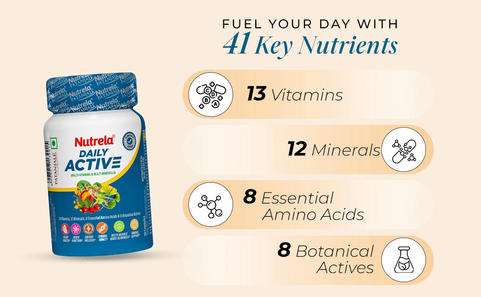 Patanjali Nutrela Daily Active Multivitamin for Men & Women is formulated to provide 6-in-1 support, including heart, eye , bones, brain , boosted energy, and immune support. This multivitamin is GMO-free, gluten-free and no added preservative, making it Suitable for vegetarians and non-vegetarians as well as people with dietary restrictions