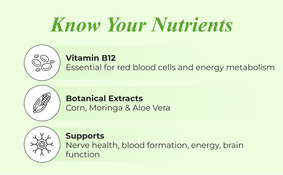 Patanjali Nutrela Vitamin B12 is scientifically formulated dietary supplement to fulfil the daily requirement of vitamin B12. Botanical extracts of Corn, Moringa, and Aloevera are combined in Nutrela Vitamin B12 to provide potent benefits of enhanced body's energy levels, general vitality, and overall wellness.1