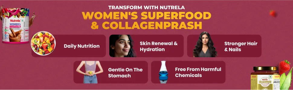 Discover a blend crafted to empower women’s health and vitality. Our Nutrela Women’s Superfood offers essential nutrients and energy to support your daily needs, while Nutrela Collagen Prash enhances skin elasticity and joint health, promoting a youthful glow and overall well-being. Nutrela Women's SuperFood is a scientifically formulated, ideal vegetarian protein blend for women with the goodness of superfoods and botanical extracts, and 13 natural herbs help to tackle stress, reduce body fatigue, and promote general well-being. Nutrela Collagenprash is an advanced anti-aging skin superfood for men and women for maintaining healthy skin, nails, and hair.